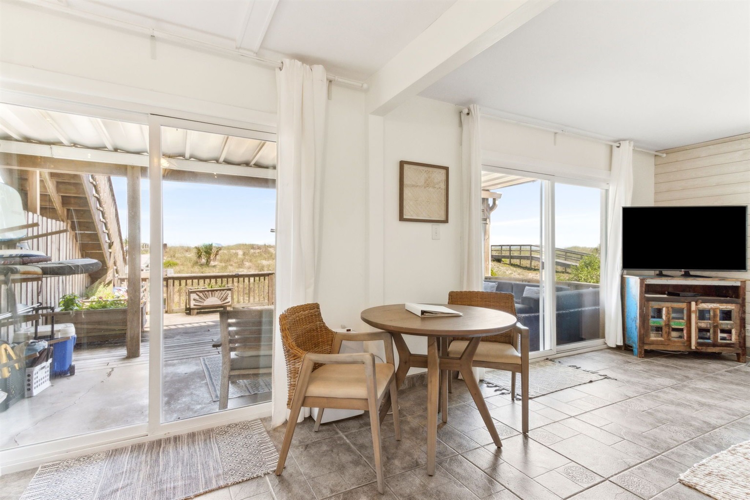 Retreat through one of the sliding doors to your own large, private oceanfront deck. Lounge in the hammock in the shade, have happy hour on the outdoor sectional, or host a dinner party at the solid teak table which seats six. Cook your own dinner and pick your fresh herbs from one of our well-maintained, raised garden beds, or have our private chef come cook in for you and your guests! Enjoy your morning coffee in one of two large lounge chairs with cushioned ottoman overlooking the dunes and listening to the sound of the waves (keep an eye out for the gopher turtles- mornings are when they love to make an appearance in the dunes!).