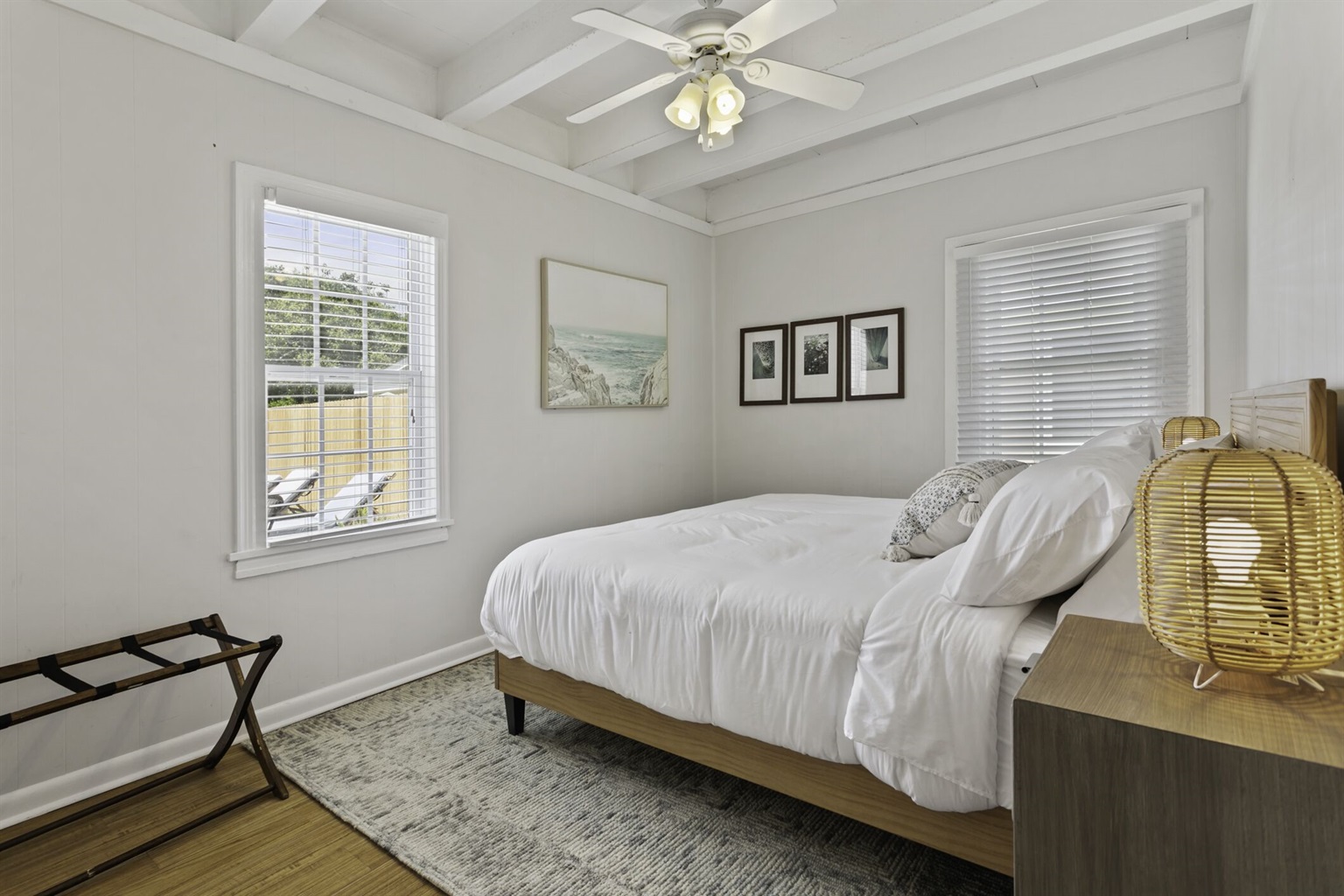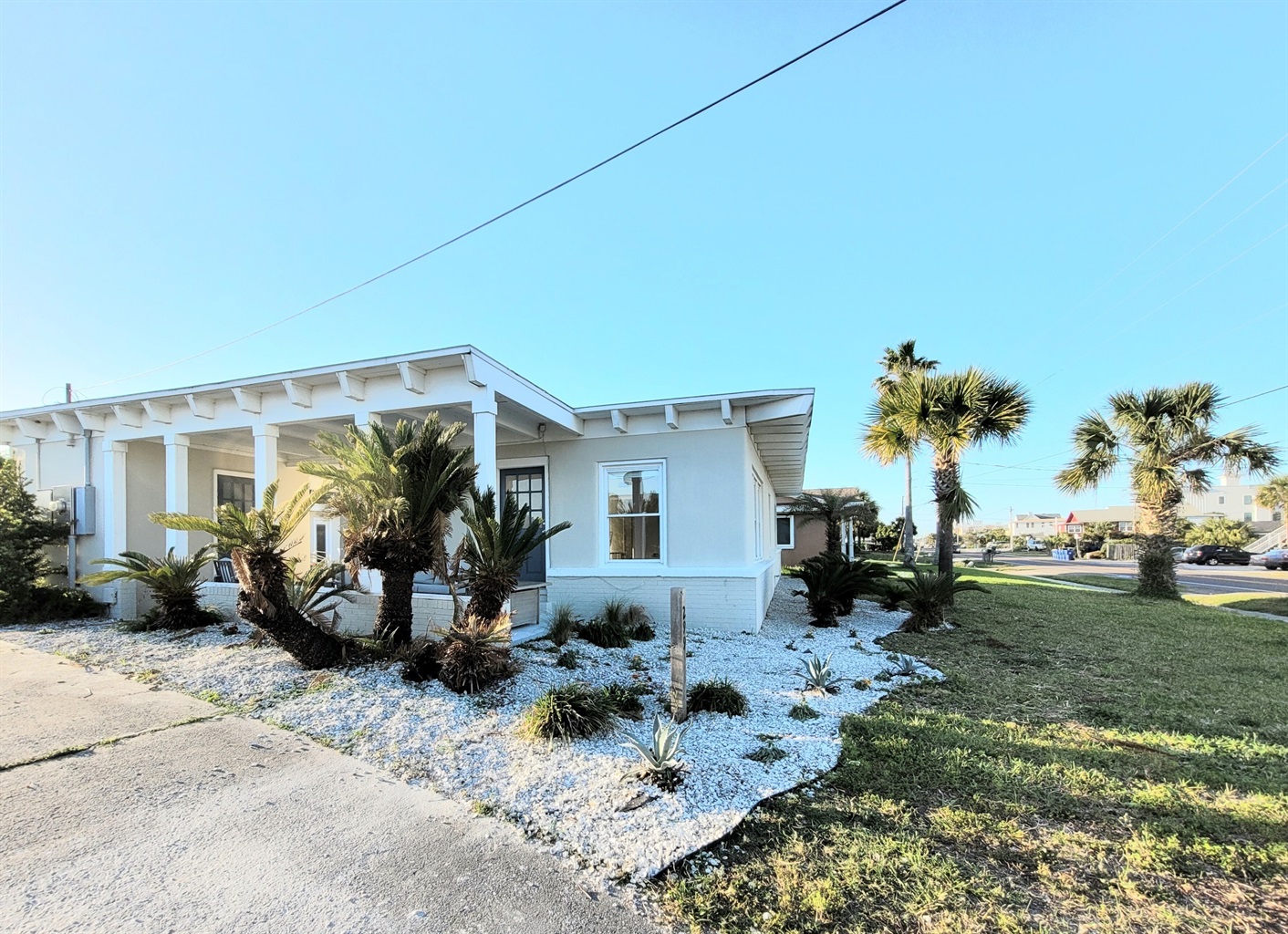 Our three bedroom pool house - directly across the street from the beach - features 3 bedrooms and 1 bathroom with extremely comfortable furnishings. The Master bedroom boasts newly updated furnishings, and is equipped with a king size bed as well as luxury linens/pillows so you can rest the night away. Bedroom 2 also contains a king sized bed, luxury linens, and relaxing décor! The third bedroom- a comfortable queen that has some great peek- a-boo views of the ocean. Relax and unwind in the fully upgraded bathroom which features a walk-in marble shower and rainfall showerhead with hand wand. In addition, there is also a 'beach bathroom' as we call it, located conveniently near the patio, is the perfect place to wash off your sandy feet after a great day at the beach! Enjoy the open concept living room with comfortable furnishings, a 65" 4k TV, and well stocked kitchen with loads of natural light spilling in. Sip your morning coffee or enjoy an evening fire on the front patio while listening to the ocean.